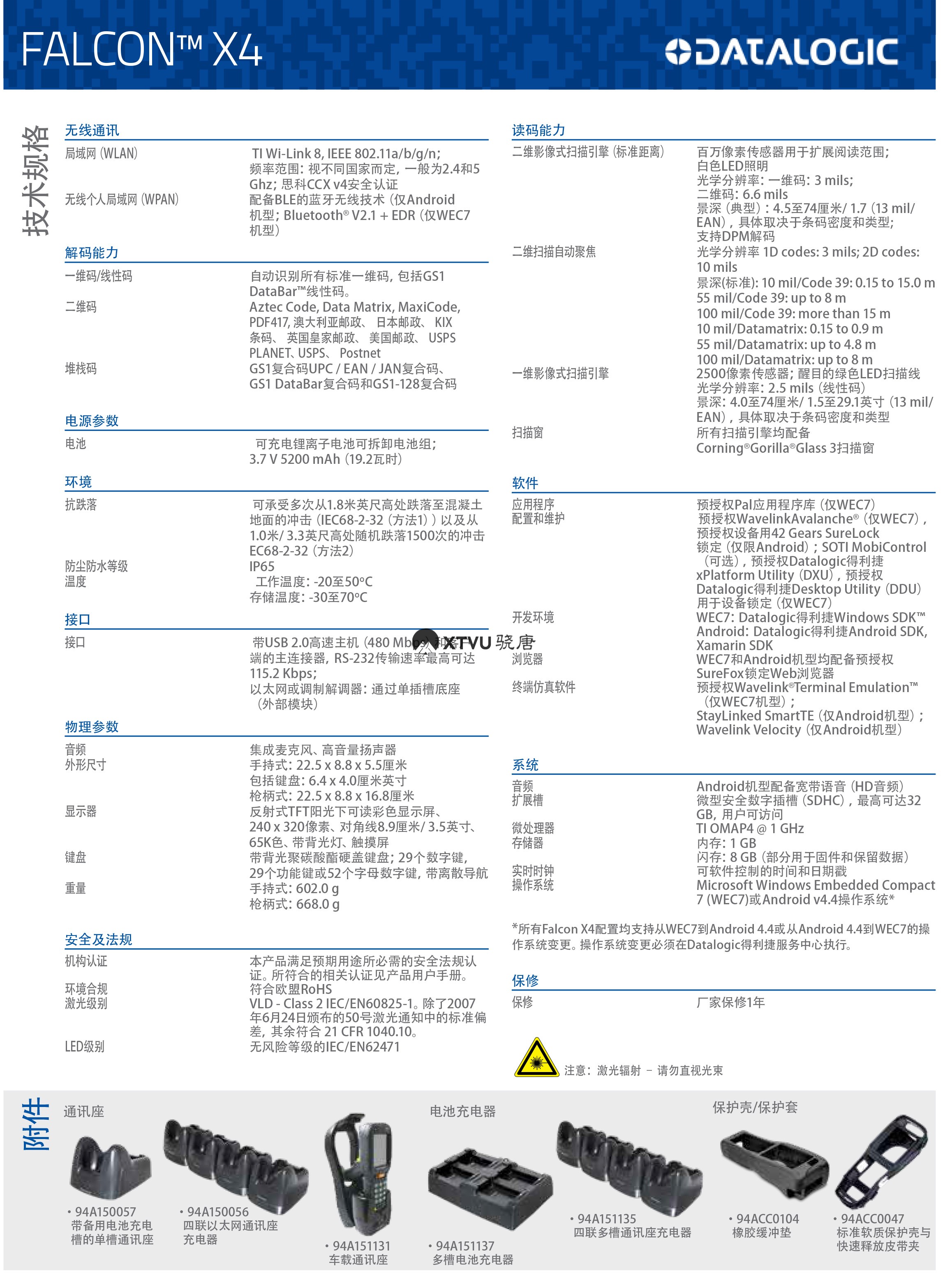 | Falcon X4 | 无线二维 | 一维、二维 | Windows Embedded Compact(WEC7)/ Android 4.4 |